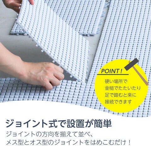 組立てカンタンジョイントの方向を揃えて並べ、メス型とオス型のジョイントをはめ込むだけ。(硬い場所でハンマーでたたいたり足で踏むと楽に接続できます)