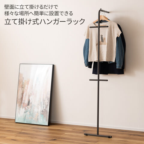 壁面に立てかけるだけで簡単に設置できる、スリムな立てかけ式ハンガーラック。