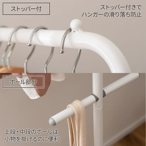 帽子やバッグの収納にも便利中段と上段にポールが付いており、カバンや帽子、ストールなどの小物類も掛けておけるので便利。