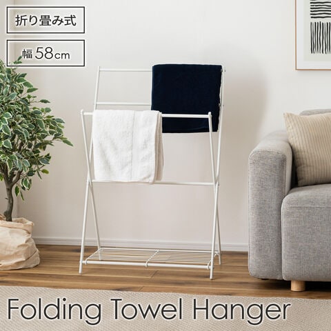 折りたたみ式 タオルラック フォールディングタオルハンガー ホワイト MIP-59 | タオル掛け ラック パイプハンガー コンパクト 物干し 軽量 バスタオル 洗濯物 室内 賃貸 リビング 新生活 棚付き インテリア 見せる収納 シンプル おしゃれ 洋服掛け スチール製
