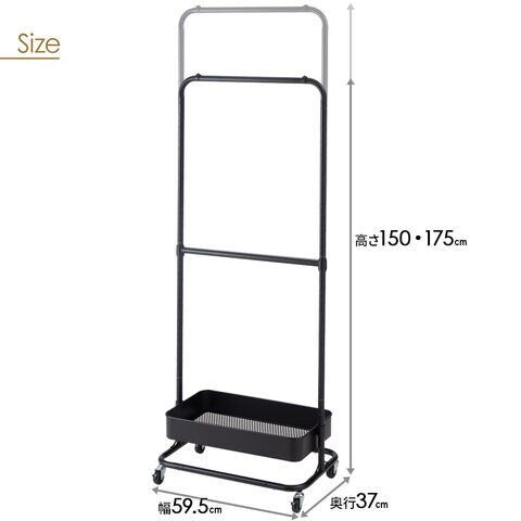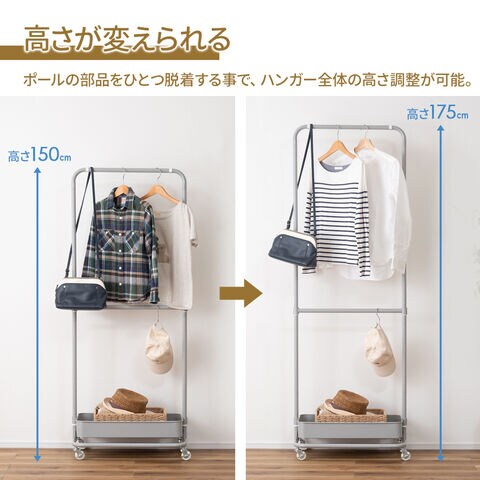 ハンガーの高さが変えられるポールの部品をひとつ脱着する事で、ハンガー全体の高さ調整も可能(150・175cm)。
