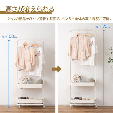 ハンガーの高さが変えられるポールの部品をひとつ脱着する事で、ハンガー全体の高さ調整も可能(150・175cm)。