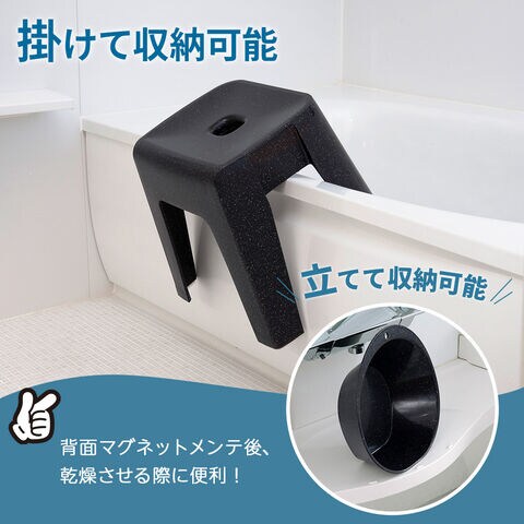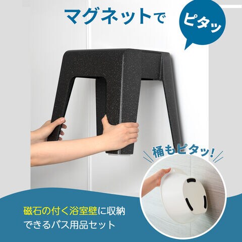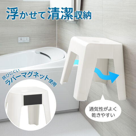 浮かせて収納スツール、ゆおけの2点ともマグネット付き。浮かせることで通気性が良くなるため、乾きが早く清潔に収納できます。