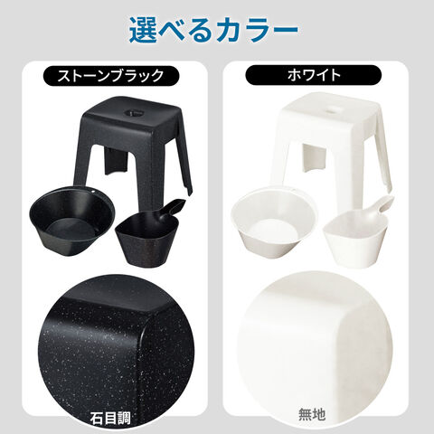 セット内容風呂椅子と湯桶の2点セット。デザインを揃えてバスルームに統一感を。