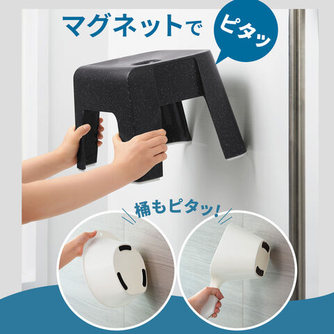 浮かせて収納スツール、ておけ、ゆおけの3点ともマグネット付き。浮かせることで通気性が良くなるため、乾きが早く清潔に収納できます。