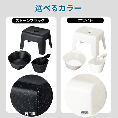 セット内容風呂椅子と湯桶、手桶の3点セット。デザインを揃えてバスルームに統一感を。