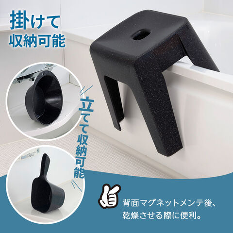 浮かせて収納スツール、ておけ、ゆおけの3点ともマグネット付き。浮かせることで通気性が良くなるため、乾きが早く清潔に収納できます。