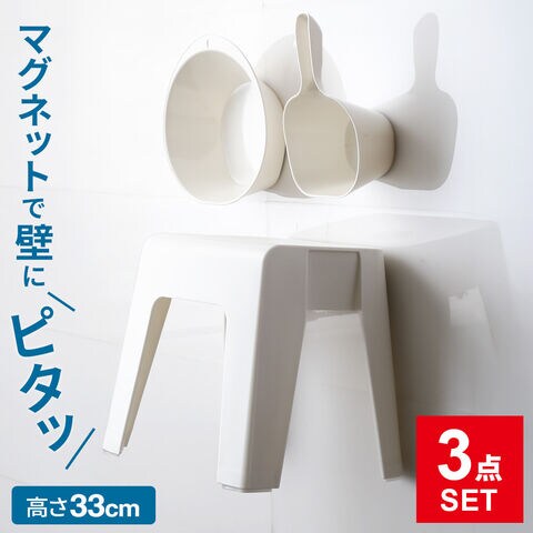 浴室3点セット 湯おけ+手おけ+風呂椅子33cm ホワイト | バスチェア 日本製 磁石付き お風呂用品 浮かせて 壁面収納 壁にくっつく 抗菌 バススツール 風呂桶 湯桶 手桶 掛湯 洗面器 バスグッズ イス 浴用 ユニード UNEED