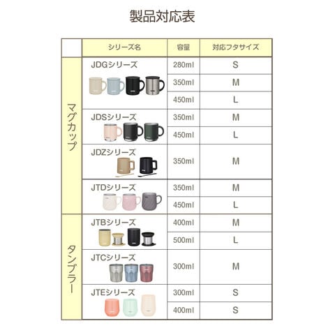 対応製品「JDG」「JDS」「JDZ」「JTD」シリーズ、280ml/350ml/450mlサイズのマグカップ。