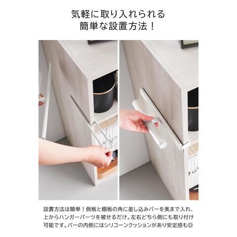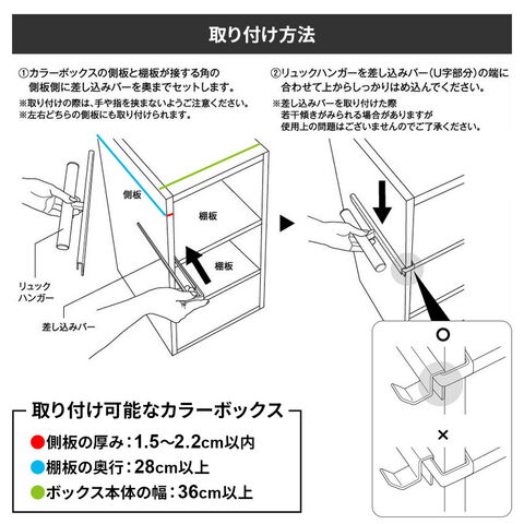 釘やネジを使わず設置できるカラーボックスの側板と棚板の角に差し込みバーをセットし、ハンガーパーツを上からはめ込むだけ。取り付け簡単。