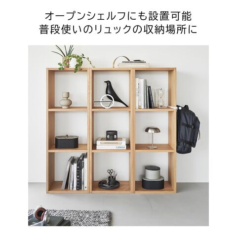 カラーボックスやオープンシェルフの側板に差し込むだけで設置できるリュックハンガー。