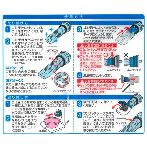 ワンタッチテープは必ず使用し、「取り外し」はゆっくり行ってください。ゴミ受けへの固定が不十分な場合、または勢いよく引き出すと、ネットが穴に取り残される恐れがあります。