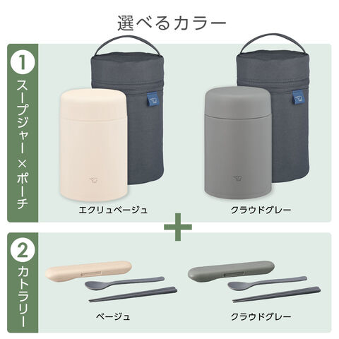 シームレスせんタイプのスープジャーと、よりおいしい温度がキープできる専用スープジャーポーチ、カトラリー(スプーン・ハシ)の3点セット。