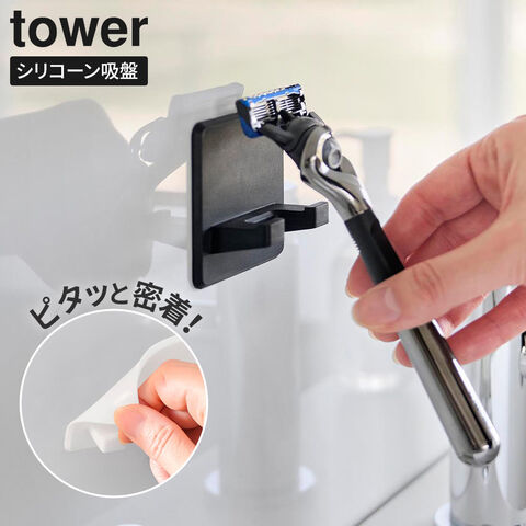 山崎実業 tower タワー シェーバーホルダー シリコーン吸盤 ブラック 10301 | カミソリホルダー 剃刀 収納 浮かせる 置き場 洗面所 鏡に付ける はがせる くっつく 簡単 取り付け 引っ掛け 吊下げ 吊り おしゃれ 白 黒 壁面収納
