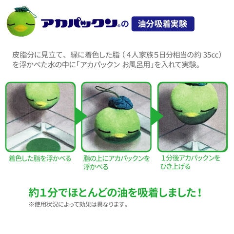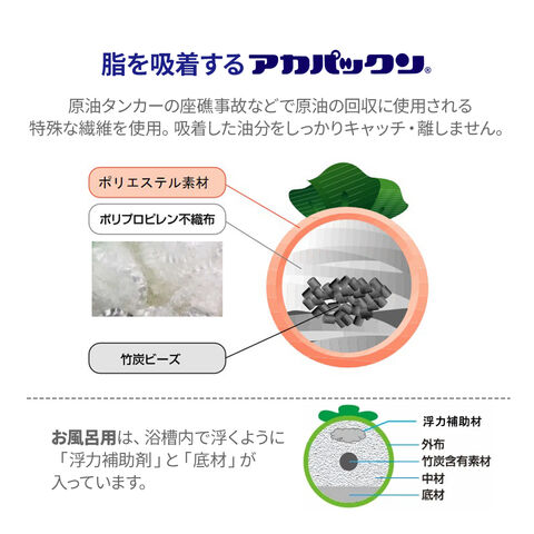 アカパックン(お風呂用)アカパックンは入浴中の垢(皮脂)を吸着するのでお湯の汚れを軽減し、浴槽の周りに付着する垢(皮脂)汚れを軽減します。