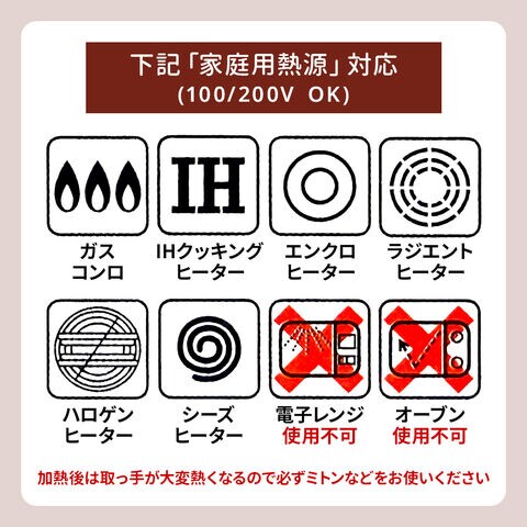 オール熱源対応ガスコンロ、IHクッキングヒーターの他、ほとんどの家庭用熱源で使えます。