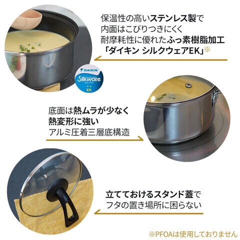 材質:本体/ステンレス鋼 内面加工/ふっ素樹脂加工(シルクウェアEK) 外面/研磨仕上げ 底面/アルミニウム合金、ステンレス鋼 ハンドル/フェノール樹脂 蓋/強化ガラス、フェノール樹脂
