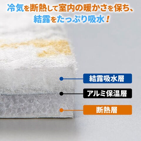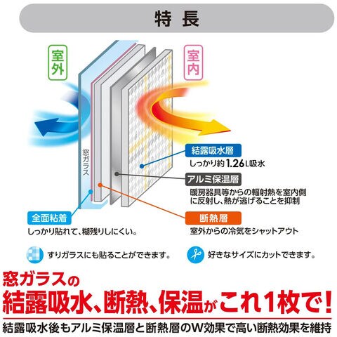 室内の窓ガラスに貼って、冷気を断熱!室内の温かさを保ち、結露をたっぷり吸水します。