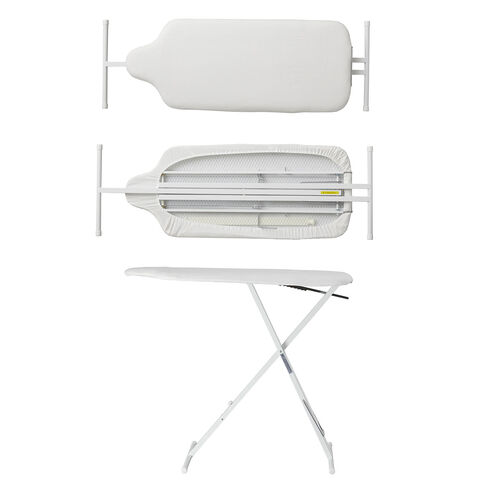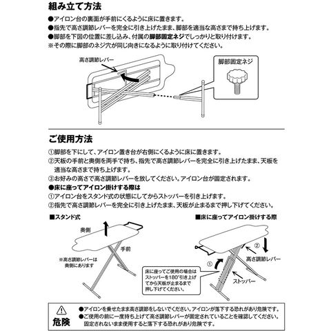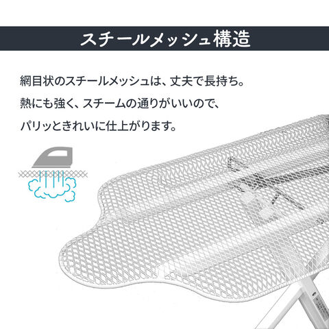 材質:【アイロン台】表面布/綿100% クッション材/ポリエステル 天板・脚部/スチール(粉体塗装) ボタンプレスゾーン(凹凸吸収クッション)/ポリウレタンフォーム アイロン置き台・高さ調節レバー/スチール(クロームメッキ) キャップ/ポリエチレン 【あて布】ポリエステル