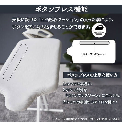 ボタンプレス機能付き服の裏からアイロンを掛けても、ボタンがアイロン台に沈み込むのでシワにならずキレイに仕上げることができます。