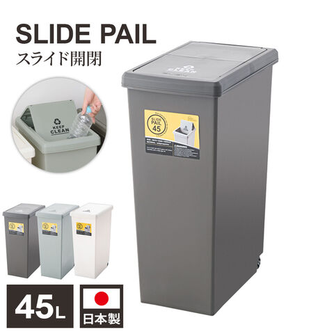 フタの端を押すと、二つに折れてスライドして開く縦型のスリムなゴミ箱。【45L】