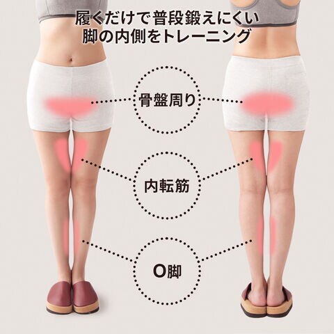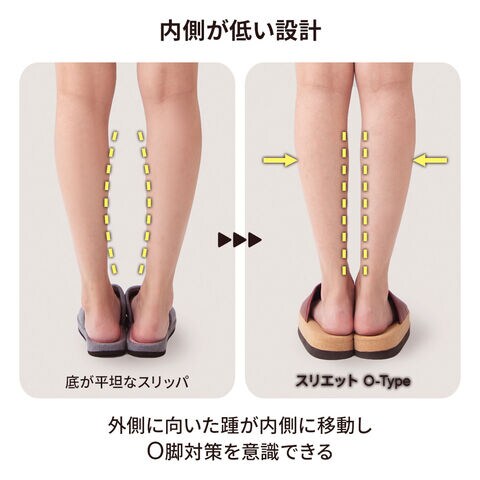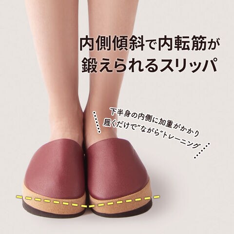 内側傾斜で普段鍛えにくい内転筋が鍛えられ、O脚対策が意識できるスリッパ。