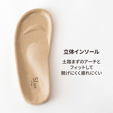 フィットして疲れにくい立体インソールと土踏まずのアーチが足裏にフィットし、脱げにくく足が疲れにくいです。