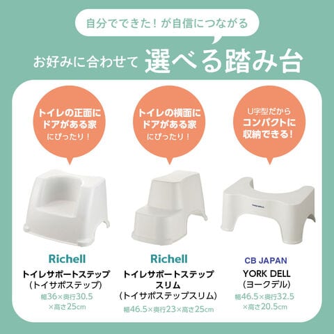踏み台サイズ(約):トイサポステップ/幅36×奥行30.5×高さ25cm トイサポステップスリム/幅46.5×奥行23×高さ25cm ヨークデル/幅46.5×奥行32.5×高さ20.5cm