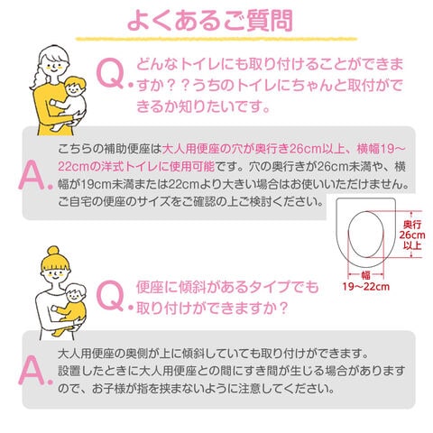 対象年齢/1才6ヵ月頃~ 体重目安/20kgまで 対応便座/大人用便座の穴が 幅19~22cm、奥行26cm以上のものに取り付けられます。