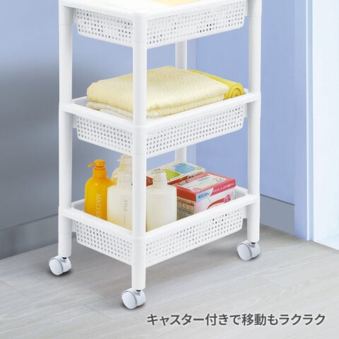 いろいろ活用できるバスケット棚バスケット棚なので、物が落ちにくく、動かす際も安心です。