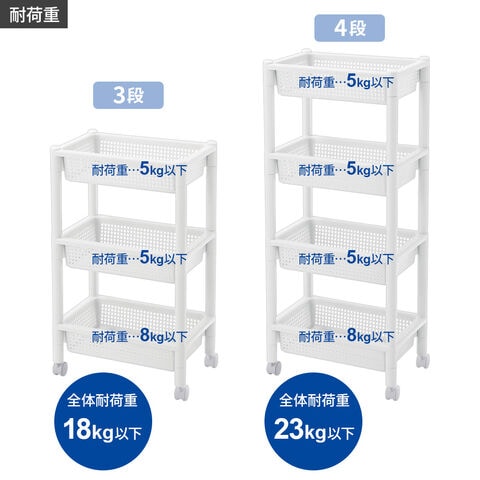 耐荷重全体で23kg以下(上段/5kg以下、中段 上/5kg以下、中段 下/5kg以下、下段/8kg以下)でご使用ください。