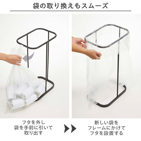 フレームにゴミ袋を掛けて上から蓋をするだけで簡単に設置できるゴミ箱。
