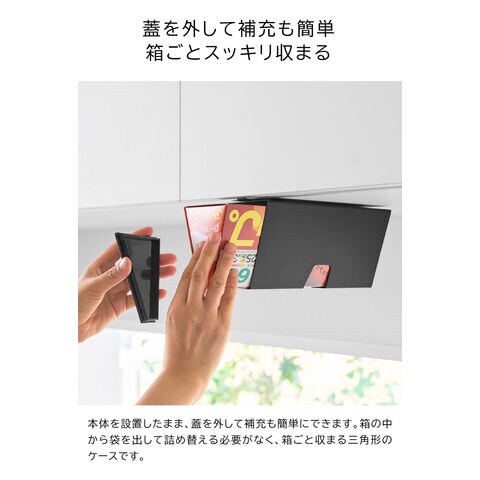 吊戸棚の設置していつでも下からサッと取り出せる、ビニール袋・ポリ袋収納ケース。