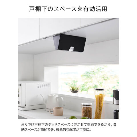 吊り下げ戸棚に差し込むだけで簡単に設置でき、中身を隠してスッキリ収納。