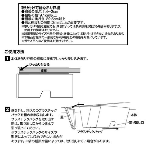 取り付け可能な吊り戸棚棚板の厚さ:1.4~2cm 棚板の幅:9.1cm以上 棚板の奥行き:22.5cm以上 扉と棚板との隙間:3mm以上が必要です。