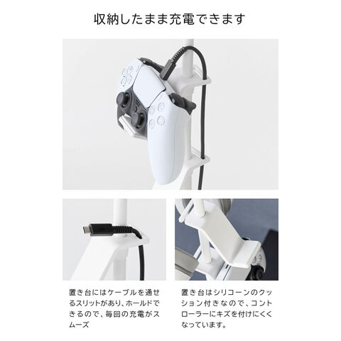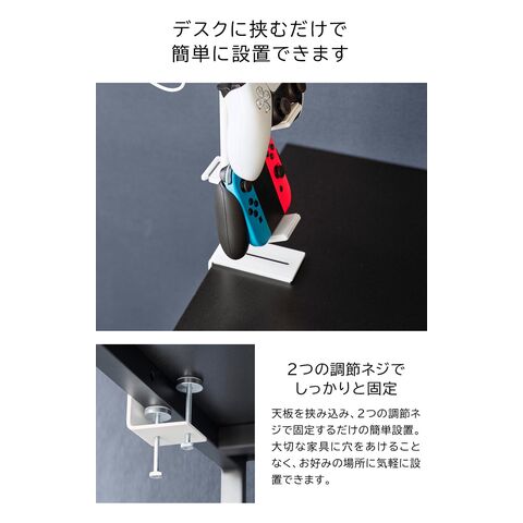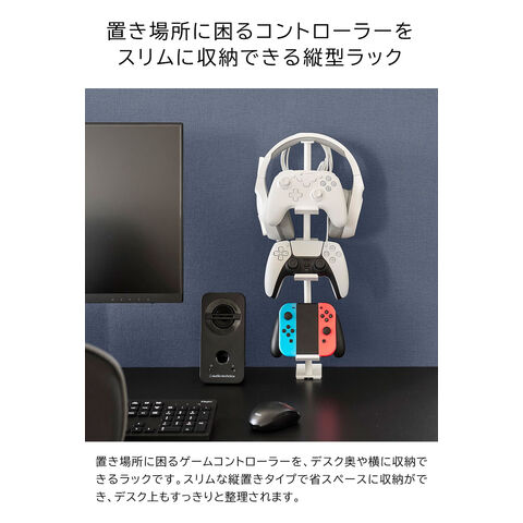 デスク奥に2個の調節ネジでしっかり固定でき、ゲームコントローラーを省スペースに収納できるラック。