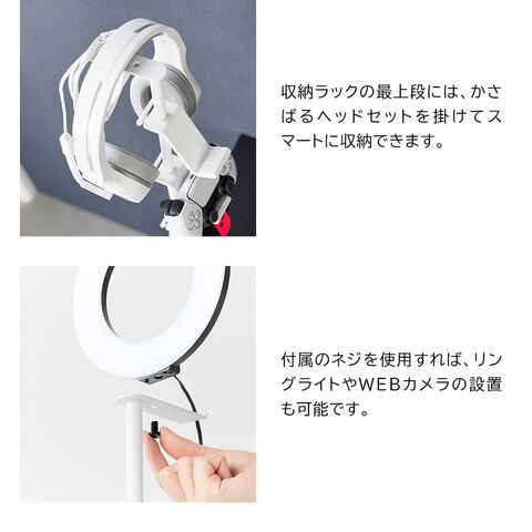 最上段にはヘッドセットや付属のネジを使用して、リングライトやWEBカメラも設置可能です。