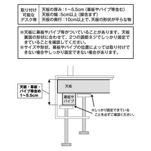 取り付け可能な場所天板の厚さが1~5.5cm(幕板やパイプ等を含む) 幅5cm以上(脚を含まず) 奥行10cm以上の平らなデスクなど。
