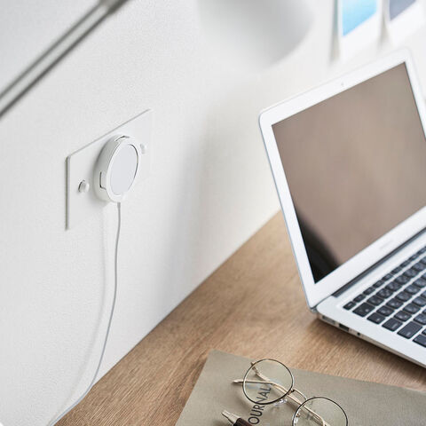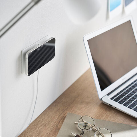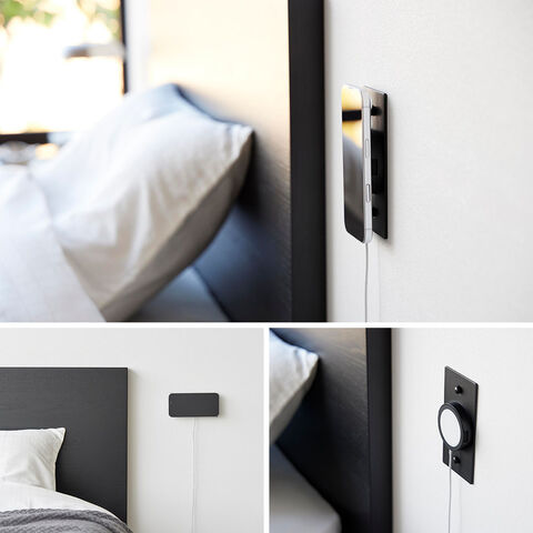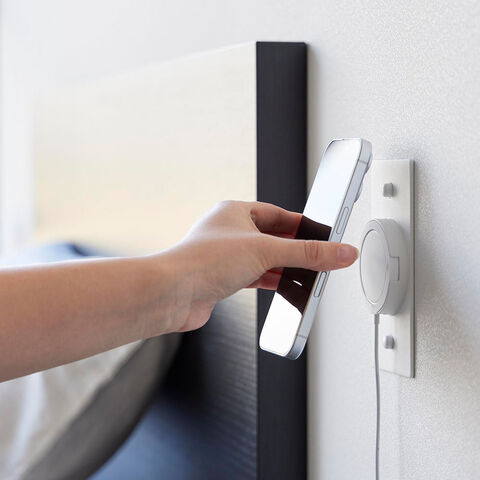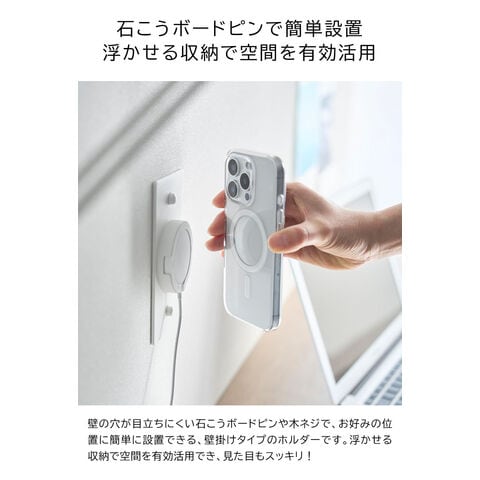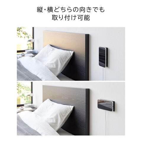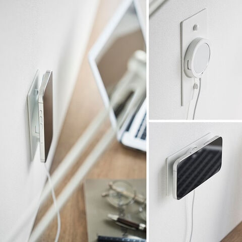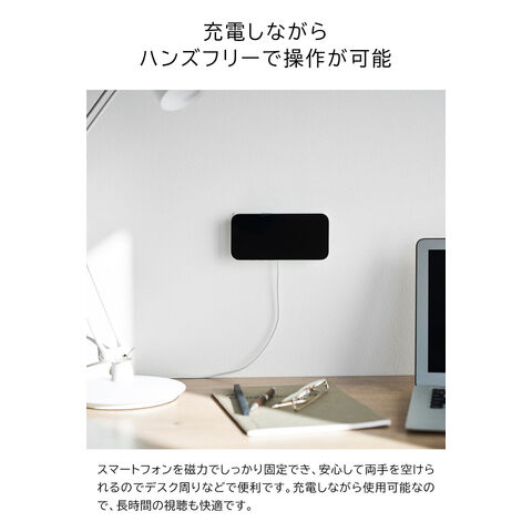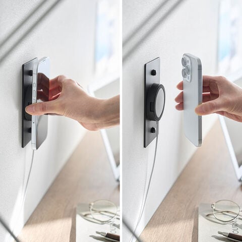 スマートフォンが磁力でピタッとくっつき、充電しながら壁面に浮かせて収納できます。