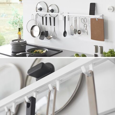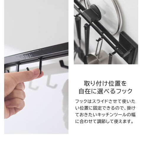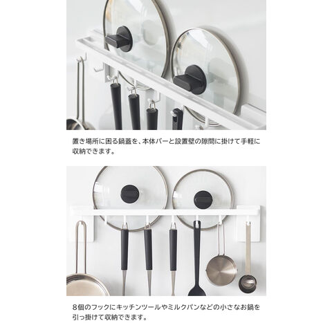 左右にスライドしてお好みの位置で使えるフックが8個ついており、キッチンツールや小さなお鍋を引っ掛けて収納できる上に、本体バーには鍋蓋を掛けて一緒に収納できます。