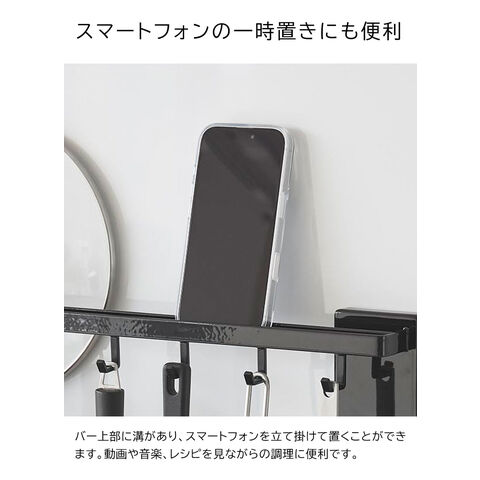 キッチンパネルなどの光沢のある面に、フィルムフックで簡単に取り付けられるキッチンツールバーです。