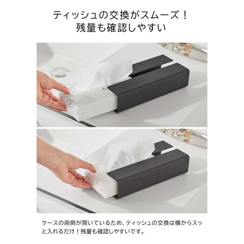 ケースの両側が開いているため、左右からティッシュの交換がスムーズにでき、残量もひと目で確認できます。