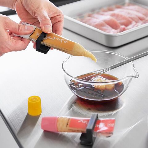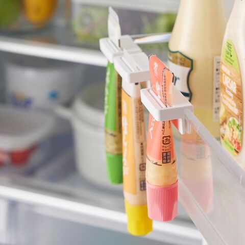 冷蔵庫のサイドポケットに 引っ掛けて収納できる 絞れる薬味チューブホルダー