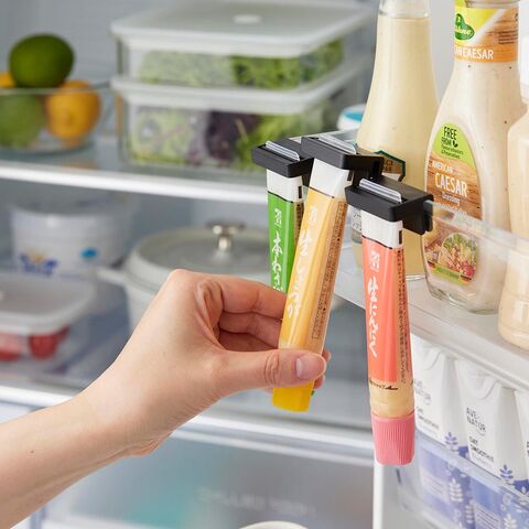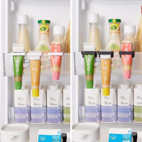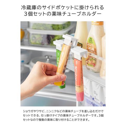 冷蔵庫のサイドポケットに引っ掛けて収納できる、薬味チューブ用ホルダーです。