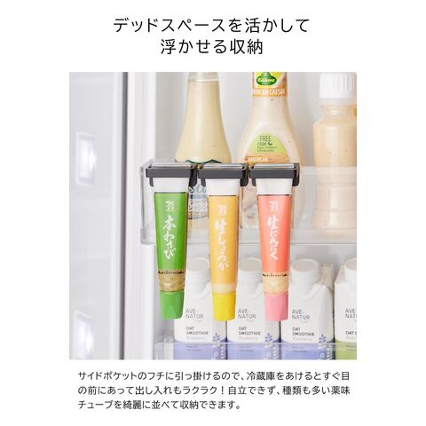 サイドポケットのフチに引っ掛けているので、冷蔵庫をあけるとすぐ目の前にあって出し入れもラクラク!ホルダーを前にずらすことでチューブを絞れる仕様なので、薬味を無駄なく最後まで使いきれます。