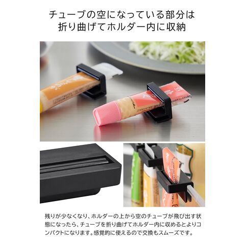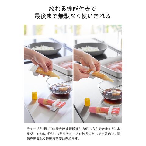 残りが少なくなり、ホルダーの上から空のチューブが飛び出す状態になったら、折り曲げてホルダー内に収めるとよりコンパクトに!感覚的に使用でき、着脱も簡単なので、薬味の交換もスムーズです。