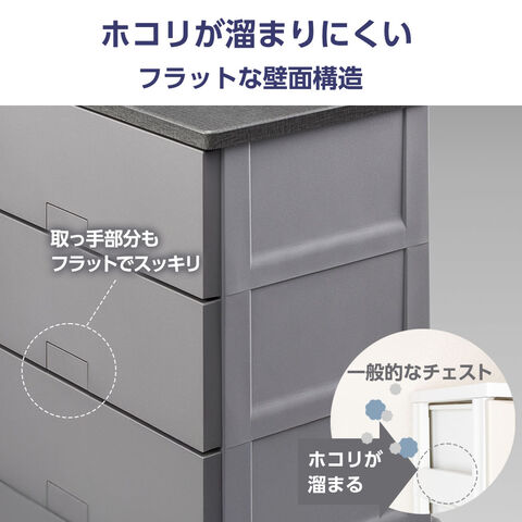 ホコリがたまりにくい構造側面・背面はフラットな壁構造で、ホコリが入りにくくなっています。掃除の手間がなく、衣類もきれいにしまっておけます。