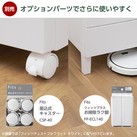別売りの「キャスター」「お掃除ラク脚」にも対応付属の脚を外して、別売りの「フィッツ 差込式キャスター40 (ストッパー付)」を取付け可能。キャスターの高さは付属脚と同じ5cmです。