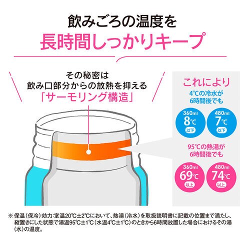 驚きの保温&保冷力!飲み口部分からの放熱を抑える「サーモリング構造」で、飲み物の温度を長時間キープ!