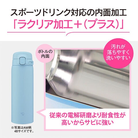 スポーツドリンク対応象印独自の加工技術、「ラクリア加工+(プラス)」で、ボトル内面は耐食性が高くサビに強い。
